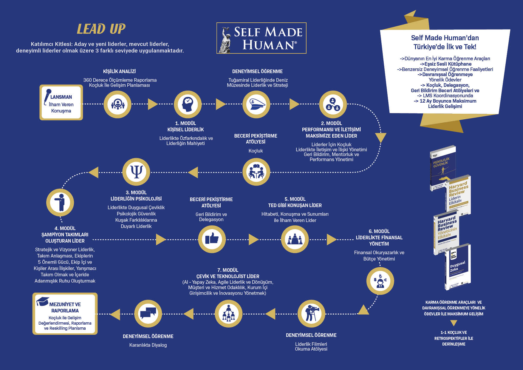 7 Eğitim Modülü, 3 Farklı Deneyimsel Öğrenme Etkinliği, 2 Ayrı Beceri Pekiştirme Atölyesi, Dünyanın En İyi Karma Öğrenme Araçları, Eşsiz Sesli Kütüphane, Davranışsal Öğrenmeye Yönelik Ödevler, Koçluk, Delegasyon, Geri Bildirim Beceri Atölyeleri ve LMS Koordinasyonunda, 12 Ay Boyunca Maksimum Liderlik Gelişimi etkisi, gücü ve kapsamı itibariyle Lead Up, dünyanın en iyi liderlik gelişim programlarından biridir.