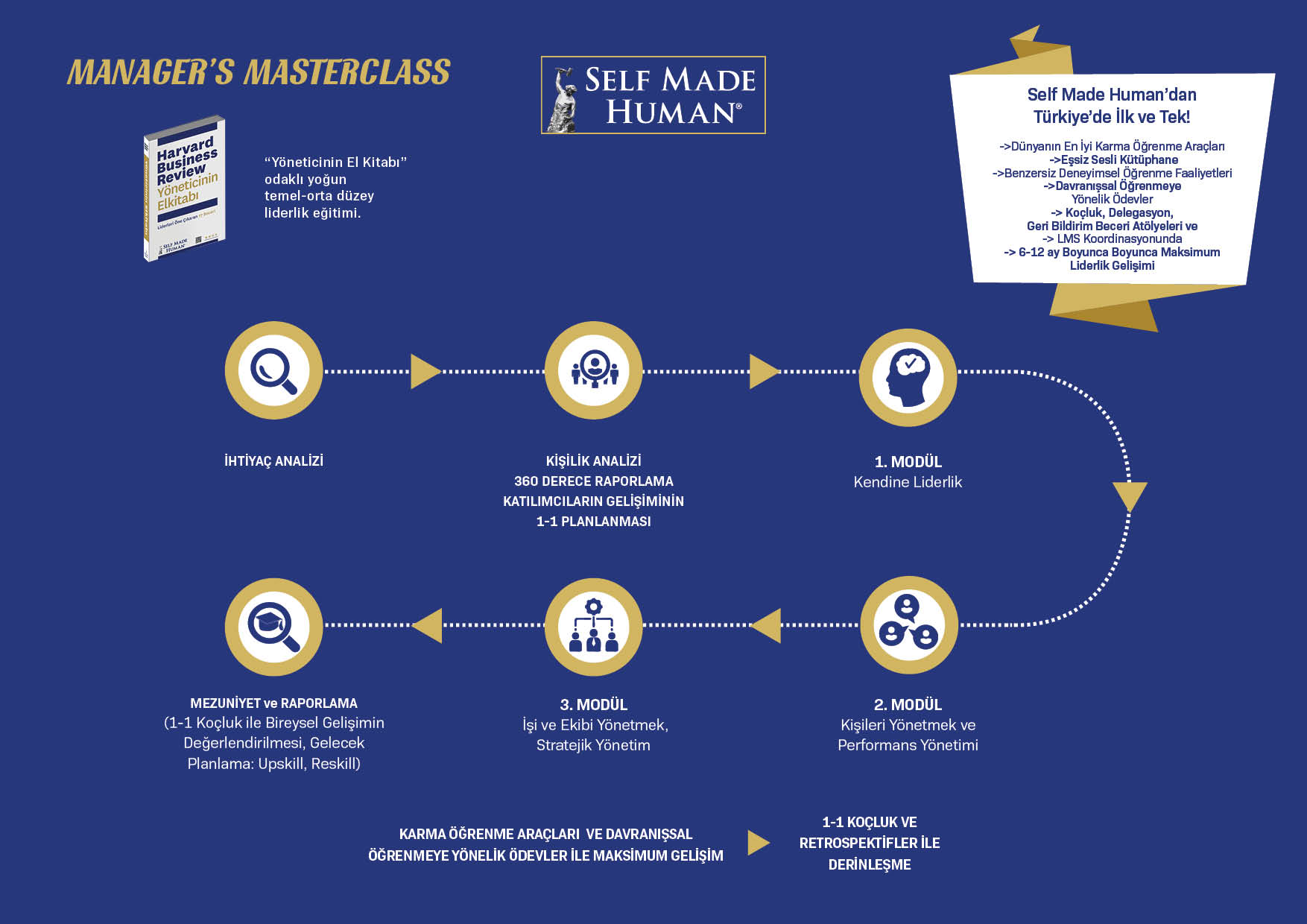 Manager’s Masterclass; yöneticilerin performanslarını en üst düzeye çıkarmalarını amaçlayan, kapsamlı ve etkileşimli bir liderlik gelişim programıdır. Dünyanın en saygın liderlik rehberlerinden biri olan Self Made Human’ın HBR Yöneticinin El Kitabı’nın karma öğrenme aracı olarak kullanıldığı bu program, liderlik zihniyetine ulaşma ve bireyin kendine liderlik etmesini merkeze alır; yönetici ve lider arasındaki farkları kavrama, kişisel itibar ve güven oluşturma, duygusal zekâyı geliştirerek ekiplere ilham verme, verimli zaman yönetimi ve stresle başa çıkma gibi önemli becerileri güçlendirir.