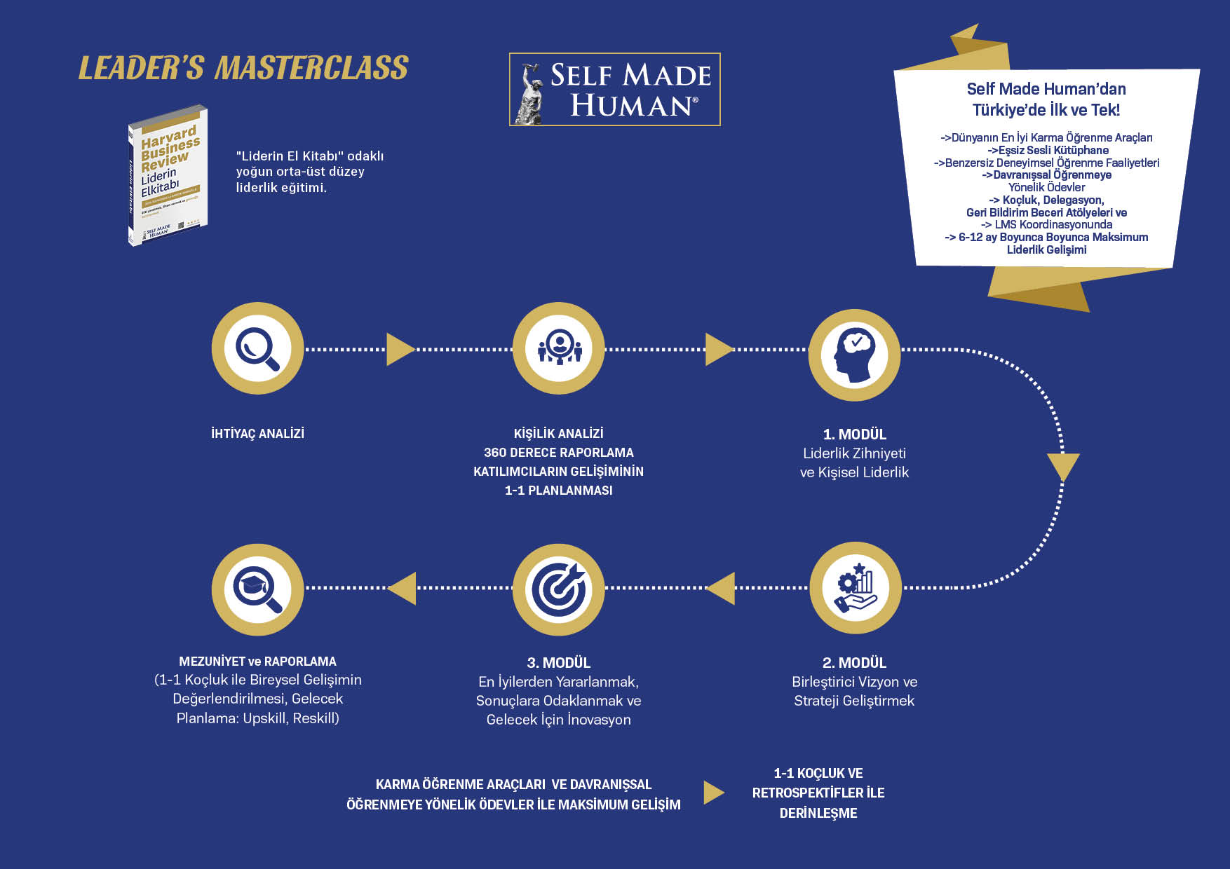 Leader’s Masterclass; deneyimli liderlerin performanslarını en üst düzeye çıkarmalarını amaçlayan, kapsamlı ve etkileşimli bir liderlik gelişim programıdır. Dünyanın en saygın liderlik rehberlerinden biri olan Self Made Human’ın HBR Liderin El Kitabı’nın karma öğrenme aracı olarak kullanıldığı program, Liderlik Zihniyeti ve Kişisel Liderlik, Birleştirici Vizyon ve Strateji Geliştirmek, En İyilerden Yararlanmak, Sonuçlara Odaklanmak ve Gelecek İçin İnovasyon modülleriyle liderlikle ilgili en önemli üst düzey yetkinlik ve becerilerin maksimize edilmesini amaçlar.