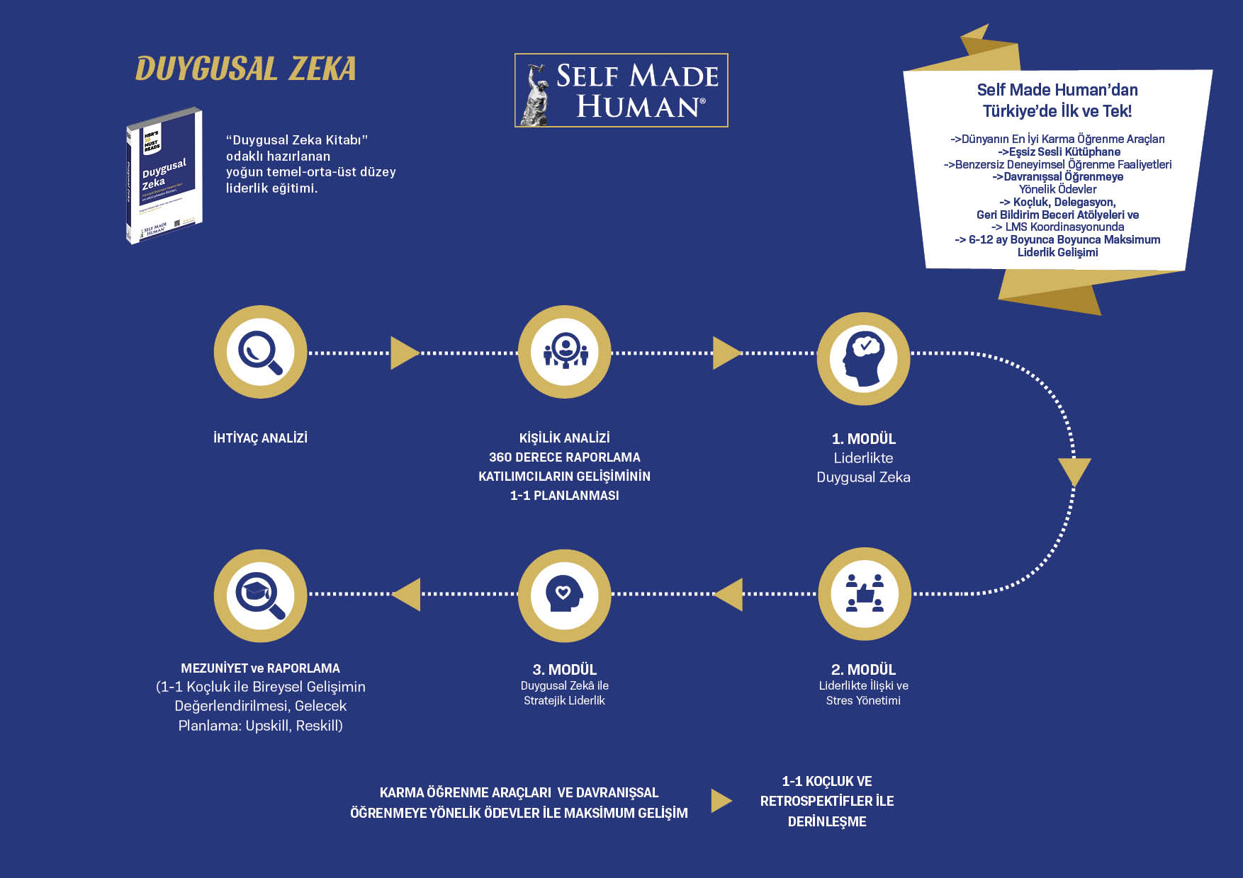 Liderlikte Duygusal Zekâ Eğitim Programı, yöneticilerin duygu,düşünce ve davranış bütünlüğünü sağlıklı ve tutarlı bir şekilde geliştirerek hem iş hem de özel yaşamlarında daha yüksek farkındalık, öz yönetim, empati ve etkili ilişki yönetimi becerileri kazanmalarına odaklanır. Self Made Human’ın dünyaca ünlü “Duygusal Zekâ” kitabının odak karma öğrenme aracı olarak kullanıldığı eğitim programı kapsamında, katılımcıların duyguları tanıma, anlama ve işbirliği geliştirme üzerine odaklanan empati temelli bakış açısıyla liderlik yetkinliklerinin güçlendirilmesi amaçlanmaktadır.
