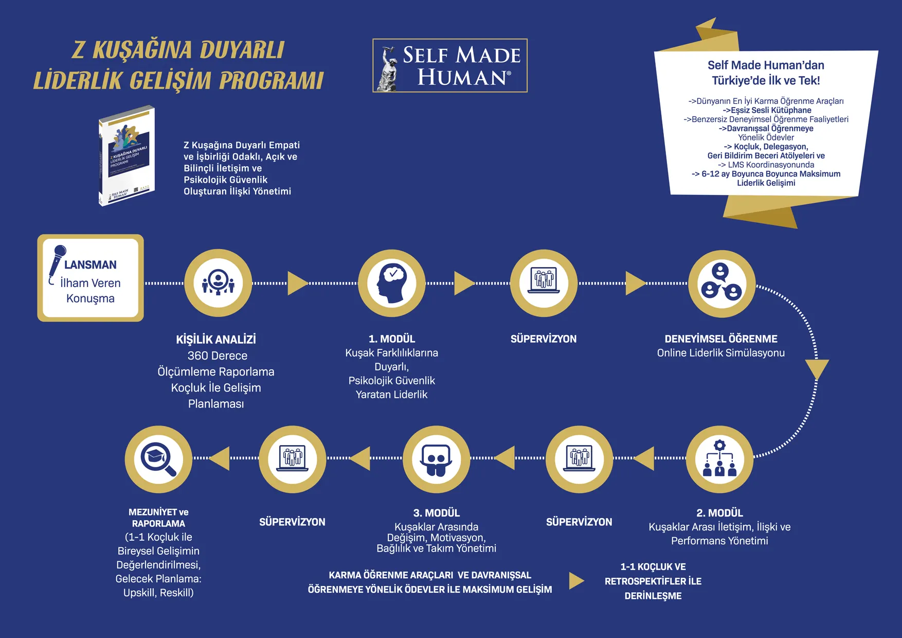 Kapsamı itibariyle Z Kuşağına Duyarlı Liderlik Gelişim Programı, yetkinlik, motivatörler, düşünme, kişilik ve davranış analiziyle ölçümleme ve raporlama, 3 Ana Eğitim Modülü, Bilgi ve Beceri Pekiştirmeye Odaklı 3 Farklı Süpervizyon Süreci, Deneyimsel Öğrenme Odaklı Online Liderlik Simülasyonu, Mezuniyet ve Bireysel Raporlama, Dünyanın En İyi Karma Öğrenme Araçları, Eşsiz Sesli Kütüphane, Davranışsal Öğrenmeye Yönelik Ödevler, Koçluk-Delegasyon-Geri Bildirim Beceri Uygulamaları ve LMS Koordinasyonu ile, 6–12 ay boyunca maksimum liderlik gelişimini sağlar.