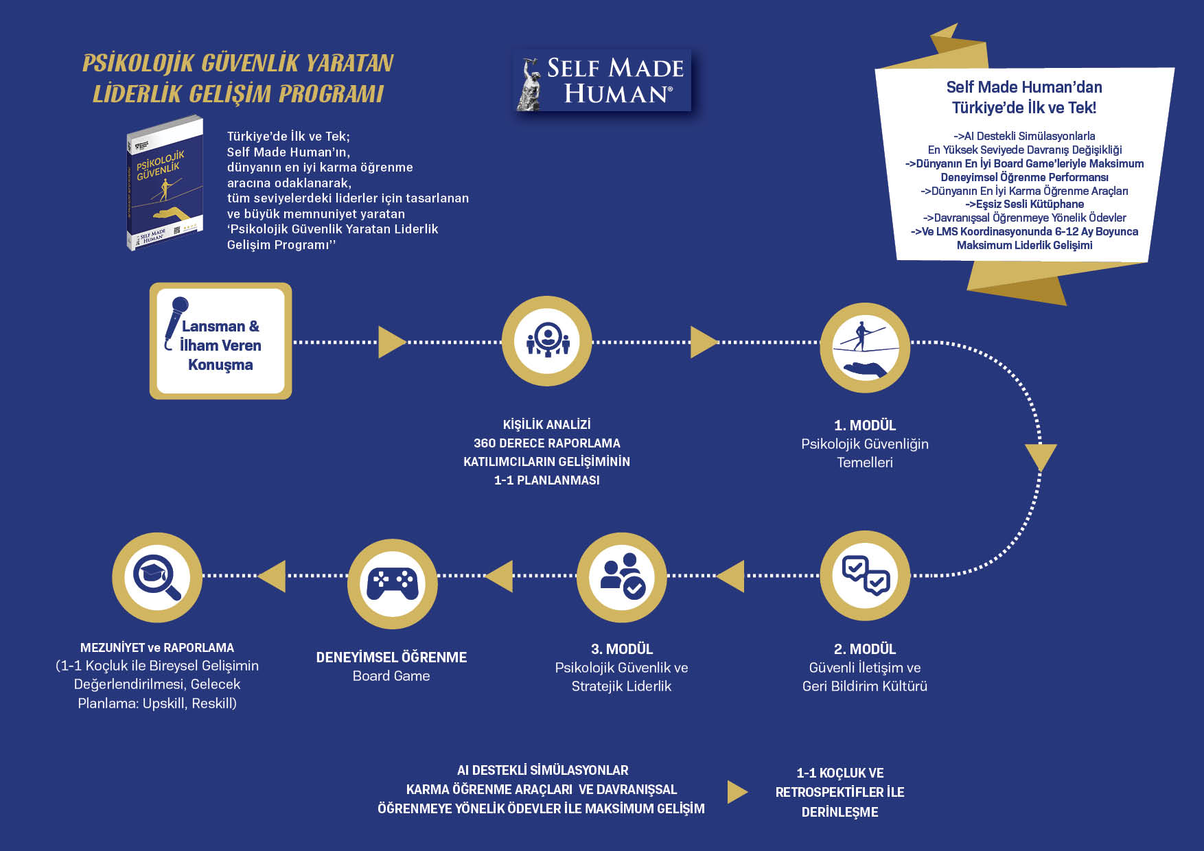 Self Made Human’ın dünyaca ünlü Psikolojik Güvenlik Kitabı’nın odak karma öğrenme aracı olarak kullanıldığı eğitim programımız, liderlere, ekiplerinde güvenli bir iletişim ve etkileşim kültürü oluşturup sürdürebilmeleri için gerekli farkındalık, bilgi birikimi ve uygulama becerilerini kazandırmayı amaçlar. Program, geri bildirim verme-alma, empati ve kriz yönetimi gibi temel liderlik yetkinliklerini derinlemesine geliştirirken, liderlerin kendi şemalarını ve modlarını tanıma sürecinde psikolojik güvenliğin ekip performansına etkisini kavramalarına ve bu doğrultuda sorumluluklarını bilinçli biçimde üstlenmelerine imkân tanır. Ayrıca, bireysel ve takım düzeyinde yeni beceriler ile stratejiler geliştirerek bu kazanımları kalıcı hale getirmeye yönelik kapsamlı bir rehberlik sunar.