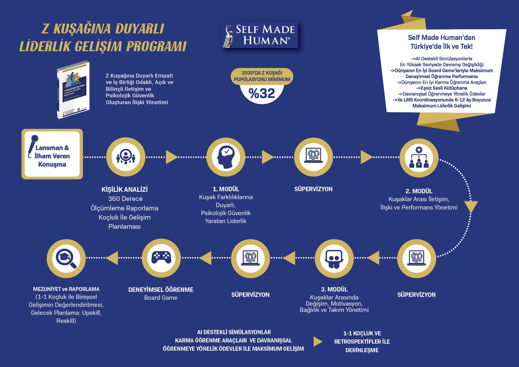 Self Made Human® tarafından Türkiye’de ilk ve tek olarak tasarlanan ve fasilite edilen program, Z kuşağıyla uyumlu ilişki kurma, motivasyon arttırma, bağlılık yaratma ve takım performansını maksimize eder; liderlerinizin kuşak yönetimi adaptasyonu odağında kültür dönüşümünü sağlar.